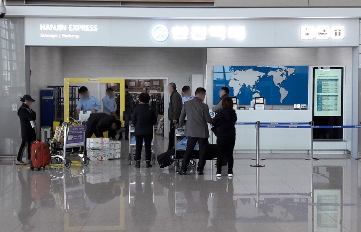 旁邊有磅秤可以量行李重量(現場有其他韓國人在寄放大衣)